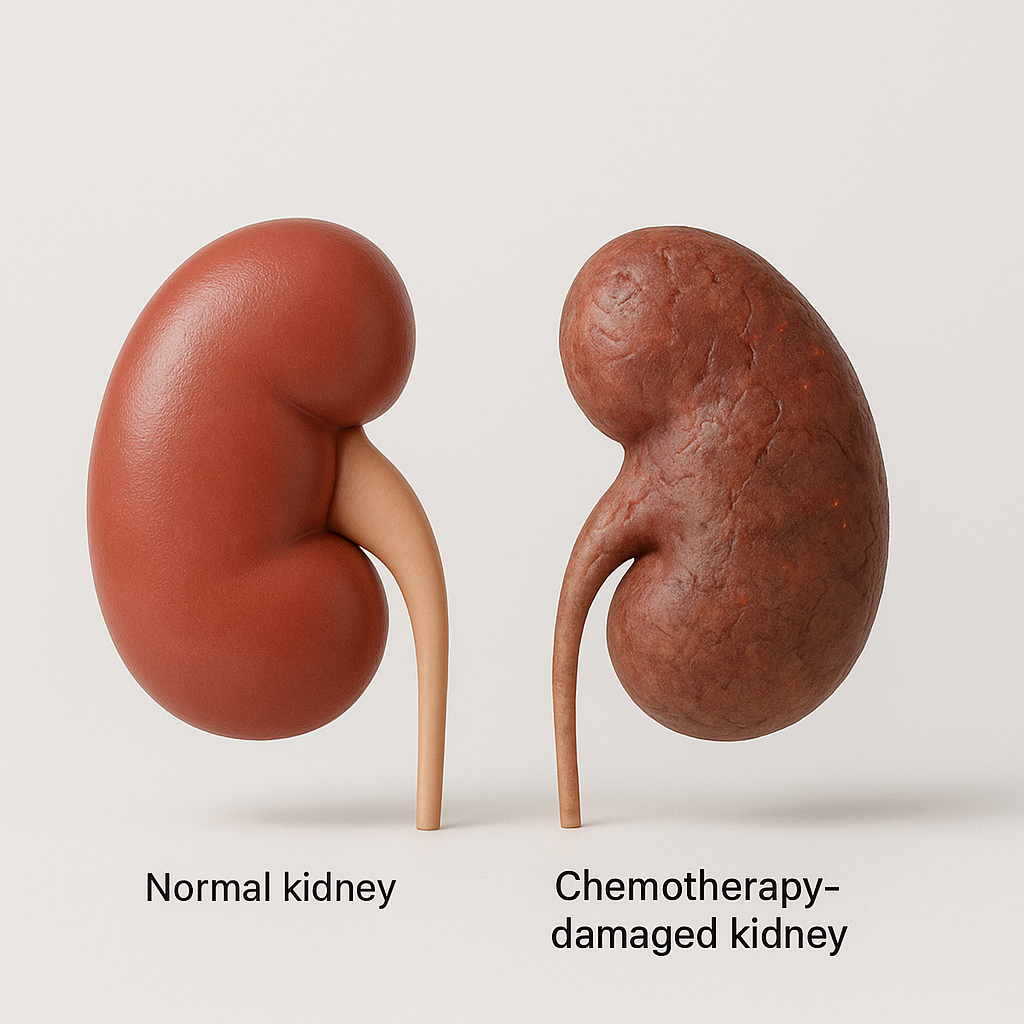The left kidney shows a smooth, healthy structure with even color and intact tissue. The right kidney shows surface cracks, dull discoloration, and stress markers — visual signs of oxidative damage and inflammation caused by chemotherapy. These changes reflect renal injury pathways triggered by drugs like cisplatin, as documented by Cascella et al. (2017), including ROS buildup, fibrosis, and loss of antioxidant defense.